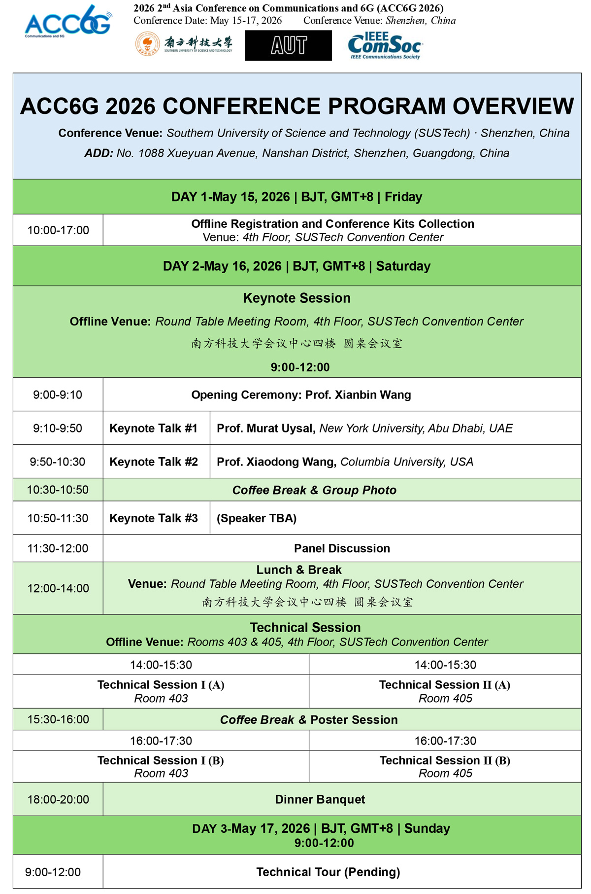 2026 2nd Asia Conference on Communications and 6G (ACC6G 2026) is organized by Southern University of Science and Technology, technically sponsored by Auckland University of Technology, IEEE Communications Society, supported by Sichuan University, Southeast University, Asia Pacific Institute of Science and Engineering(APISE) and Hong Kong Association for Advanced Scientific Research(HKAASR), and media supported by Radio Communications Technology, Radio Engineering, MOBILE COMMUNICATIONS, Communications Technology, 6G Standards and Technological Exploration, JOURNAL OF XI'AN JIAOTONG UNIVERSITY, will be held in Southern University of Science and Technology (SUSTech) · Shenzhen, China from May 15 to 17, 2026.
